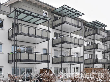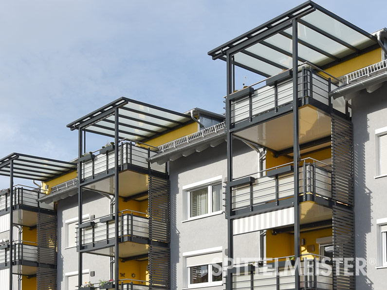 Unsere Spittelmeister Balkondächer bestechen durch Eleganz und optische Leichtigkeit und sind trotzdem extrem stabil. Die farblich auf Ihre Fassade und den Balkonrahmen abgestimmten Dachkonstruktionen unterstreichen entweder die leichte Optik oder setzen interessante und markante Akzente.